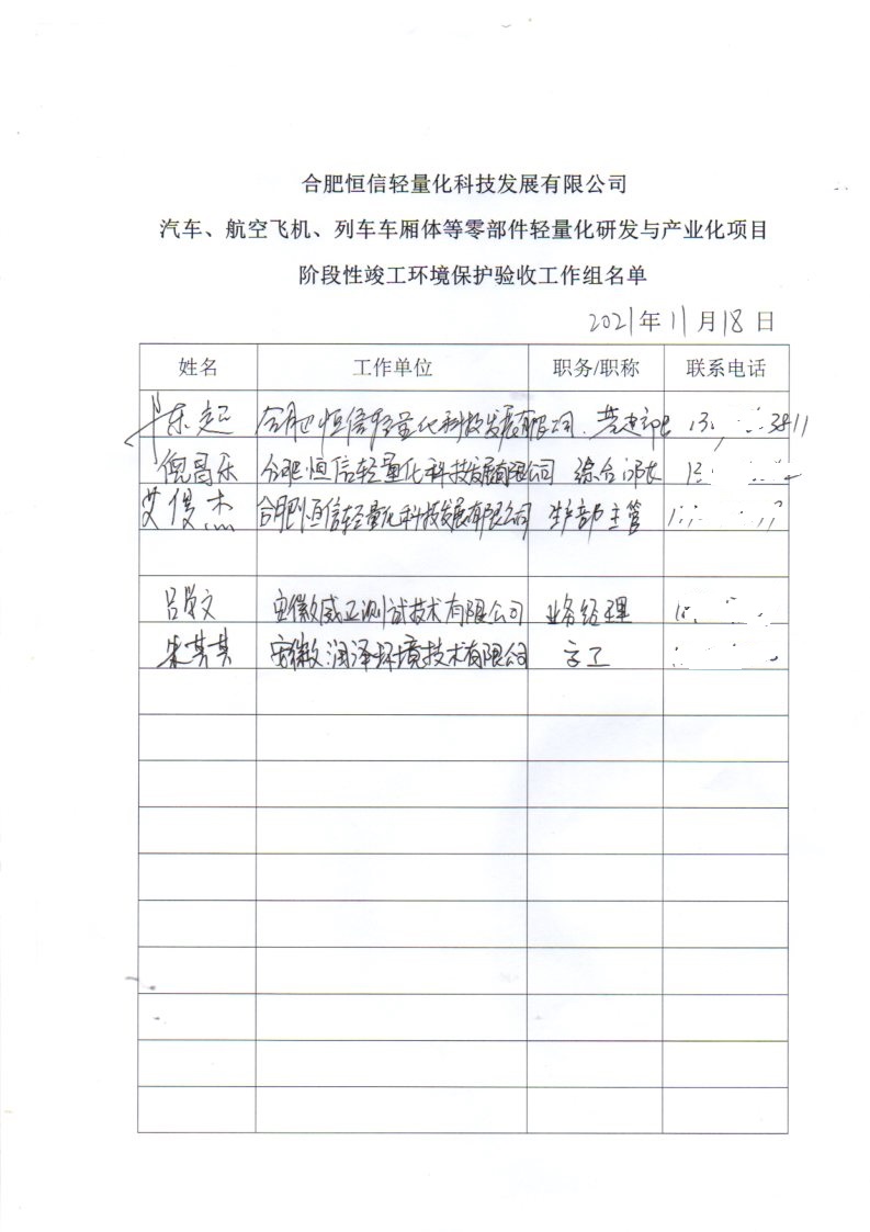- 6 合肥恒信輕量化科技發展有限公司汽車、航空飛機、列車車廂體等零部件輕量化研發與產業化項目階段性竣工環境保護驗收報告公示